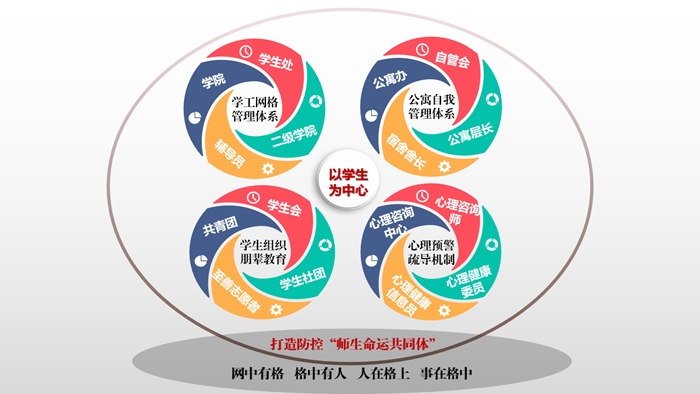 按照“网中有格、格中有人、人在格上、事在格中”的管理服务格局,织好四张“网”,发挥“三全育人”作用,打造防控“师生命运共同体”。一是完善“学院—学生处—二级学院—辅导员”四级“学工网格管理体系”,将疫情防控责任落实落细;二是压实“公寓办—自管会—层长—舍长”四级“公寓自我管理体系”,将疫情防控意识、卫生健康知识、安全卫生管理细化于学生生活区,努力做到全覆盖、无死角;三是畅通“心理健康教育与咨询中心—心理咨询师—心理健康委员—心理健康信息员”四级“心理预警疏导机制”,线上线下发力,筑窂学生心理防线;四是发挥“共青团—学生会—学生社团—‘至善志愿者’”四类“学生组织朋辈教育”,畅通诉求渠道,发挥新媒体作用,榜样示范引领,教育引导、志愿服务和课程学习“三不落”。
