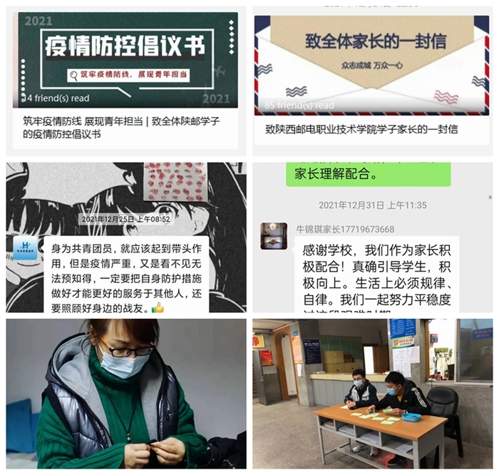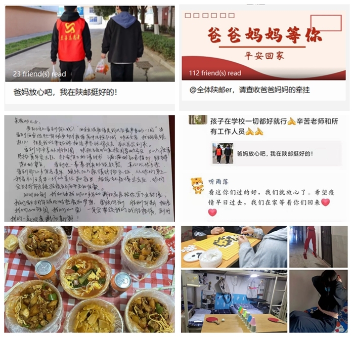 体现辅导员桥梁作用,线上线下齐发力,不断加强家校协同,形成疫情下育人工作合力。辅导员“点对点”通过线上视频会议、电话连线等形式,第一时间向家长说明学校疫情防控工作要求和相关学生管理举措,积极回应家长关切,争取家长理解和配合,确保教育关爱不断线。“陕邮学工”“陕邮团委”等新媒体先后发布《致师生们的疫情防控倡议书》、《致陕西邮电职业技术学院学子家长的一封信》、《筑牢疫情防线展现青年担当|致全体陕邮学子的疫情防控倡议书》、《爸妈放心吧,我在陕邮挺好的!》等推文,大量家长转发评论,在校学生也纷纷收到远在家乡的父母的鼓舞和勉励。