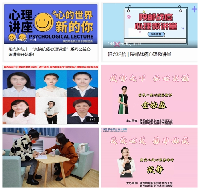 第一时间开通“阳光护航”心理热线和“陕邮抗疫心理微讲堂”,六名国家心理咨询师全天候线上值守,为因疫情而产生心理困扰的师生提供真情守护服务。同时,组织我院咨询师参加陕西省抗疫热线心理援助平台,和全省高校心理志愿者一同为有需要的广大学生提供心理援助服务。全面开展学生心理动态摸排和不定期随访,向各班级推送心理防疫知识,转发心理防疫倡议,组织收看心理防疫主题讲座,筑窂学生心理防线。