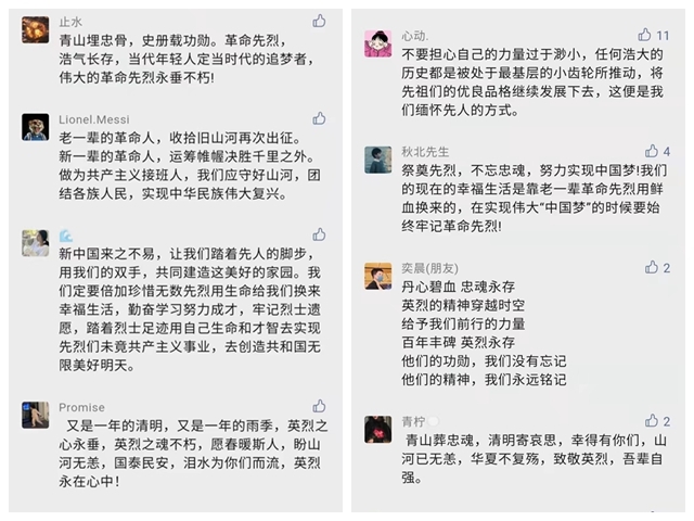 清明祭英烈,云端表哀思。在本次主题团日活动中,各班级团支部书记积极组织同学们登录团委微信公众号,通过“云端”祭奠先烈、敬献花篮、重温入团誓词,留下感言等形式表达对革命先辈们的敬意与感恩,不忘他们用鲜血和生命铸就的民族精神,铭记他们为党和人民建立的不朽功勋。