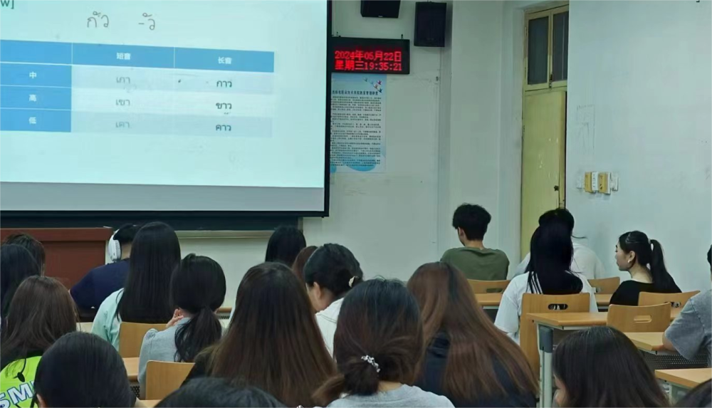 活动首先由社团指导老师为大家简要介绍了泰语的基本概况。紧接着,进行泰语5种音调的学习。现场,通过趣味游戏和小组练习,同学们亲身体验了不同声调给单词含义带来的微妙变化,笑声与惊叹声此起彼伏,大家在轻松愉快的氛围中进行本次基础知识的学习。