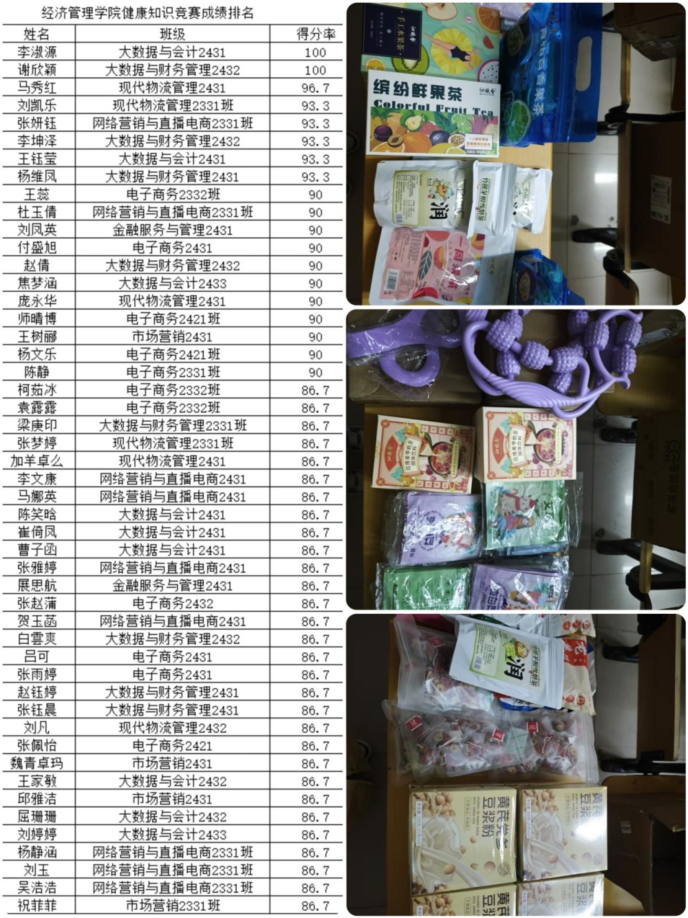 为了鼓励更多学生参与到活动中来,经济管理学院易班工作站特别准备了丰富的奖品,包括实用的宿舍健身器材、美味的水果茶、滋补的红枣茶、健康的豆浆粉、温暖的暖宝宝、放松的蒸汽眼罩以及舒缓疲劳的泡脚粉等49份礼品。