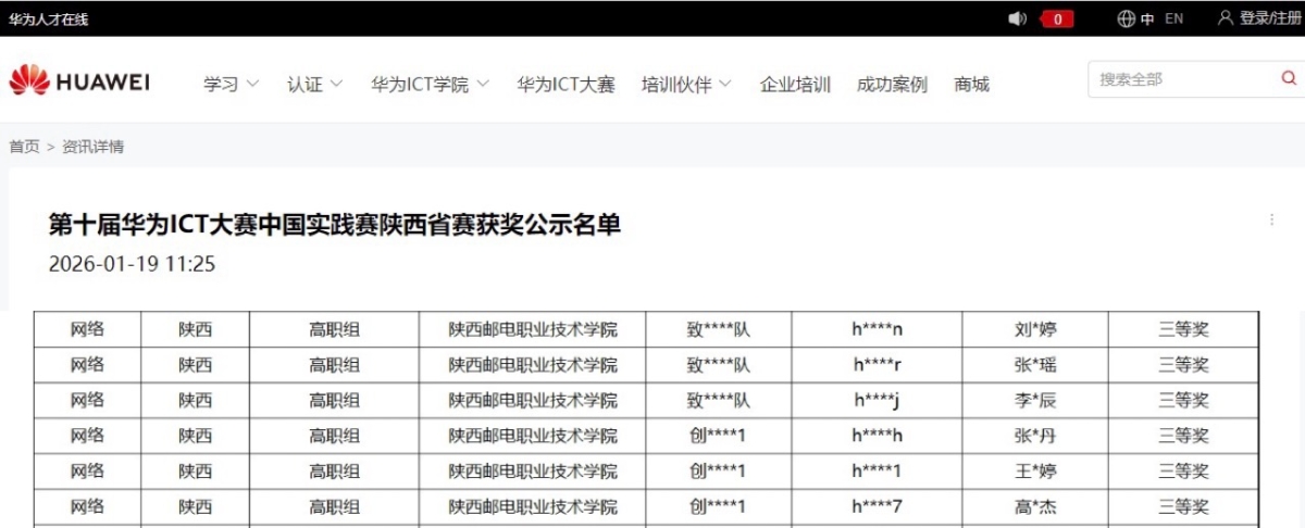 2026年1月19日,第十届华为ICT大赛中国实践赛省赛获奖名单正式公示,我校信息通信学院两支参赛团队凭借扎实的专业功底、娴熟的实践技能与出色的团队协作,在比赛中脱颖而出,双双荣获陕西省赛三等奖,用实力为学校赢得荣誉。